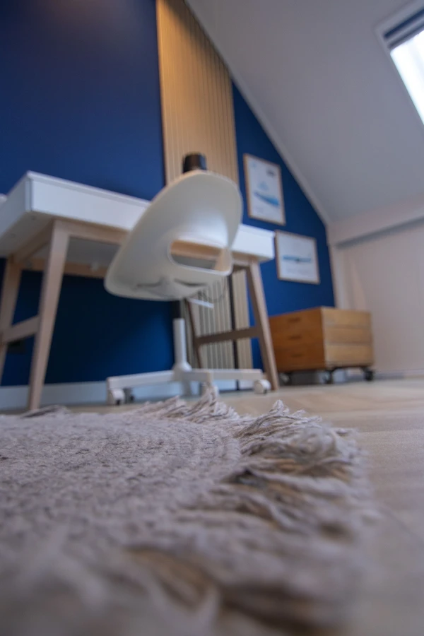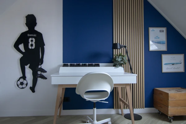 Voor deze jongenskamer mocht ik een ontwerp maken waarin blauw de hoofdrol speelt. De wens was duidelijk: het moest een stoere kamer worden die past bij een echte voetballer.