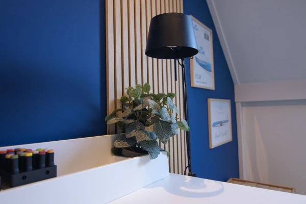 Ik koos voor een frisse basis met een blauwtint aangevuld met natuurlijke materialen en zwarte accenten voor een stoer contrast. Het persoonlijke hoogtepunt van deze kamer is de wanddecoratie van metaal die ik zelf heb ontworpen. Het silhouet van de jongen is hierin uitgesneden. Een uniek en blijvend detail dat perfect past in deze kamer. Het resultaat is een eigentijdse, stoere kamer met een persoonlijk accent.