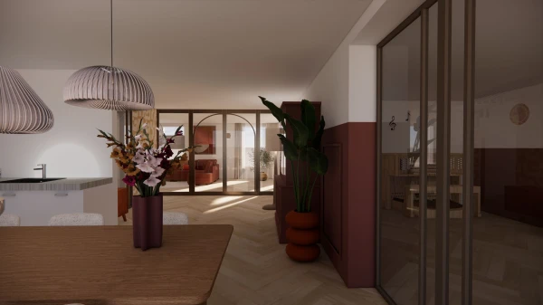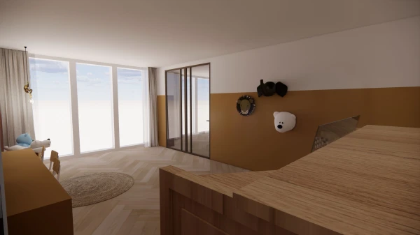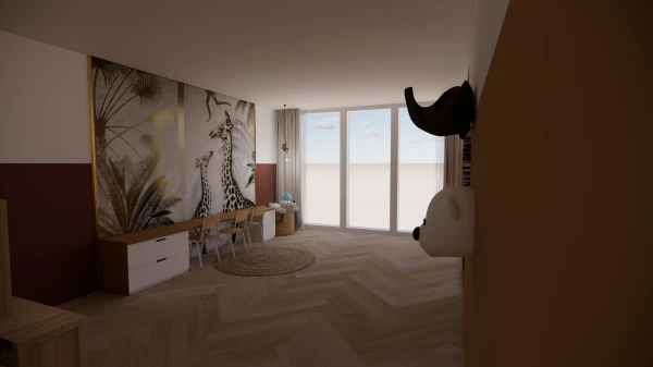 Om een warme en sfeervolle basis te creëren én tegelijkertijd de wensen van beide ouders te respecteren, heb ik gekozen voor een kleurrijk geheel. Kleurrijkheid komt niet alleen terug in de leefruimtes, maar ook in de kinderkamer. Deze bevindt zich in een ruime uitbouw, een voormalige garage, die is omgebouwd tot één grote kamer. Hier hebben de kinderen volop ruimte om te spelen, leren en zich terug te trekken, terwijl het licht en de openheid de kamer een gezellige en uitnodigende sfeer geven.